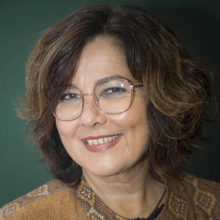 Anna-Marie Watson PCC headshot photo, woman with brown hair and blue eyes resting chin on her hand wearing colorful top